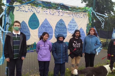 Representatives of the Cambridge Schools Eco Council showed their support for the River, with Jona Cordonnier-Gehring, left, Nico Cordonnier Gehring, centre, and Junayd Islam, 2nd from right and Ella Hone, right.