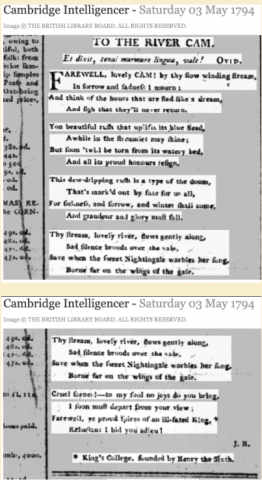 Antony Carpen, community historian has dug up a poem about the Cam from the lat 18th Century. Antony says: "A very old poem published in one of Cambridge’s earliest newspapers, the Cambridge Intelligencer was a short-lived radical newspaper active at the very end of the 18th Century. I spotted this poem about the River Cam in it, which will be of interest to today’s generation of residents and campaigners who very recently gathered to declare the Rights of the River Cam in June 2021."